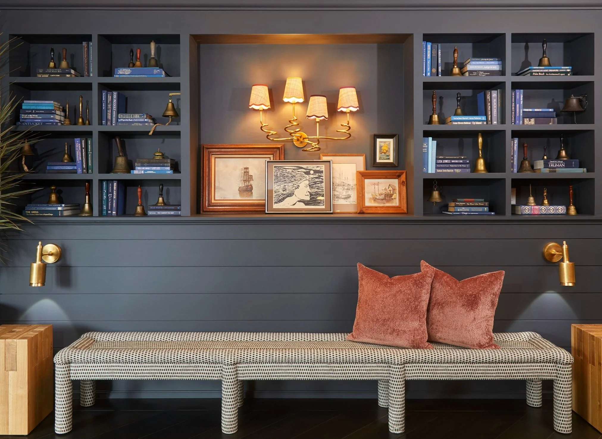 The Julien Chichester sconce at the center of the bookcase acts as a focal point, surrounded by a constellation of tonal blue books, brass bells collected from various antique stores in New England, and curated paintings and prints. The custom upholstered bench brightens the vignette and is flanked by complimentary brass sconces and warm wood side tables which add depth and warmth to the palette.